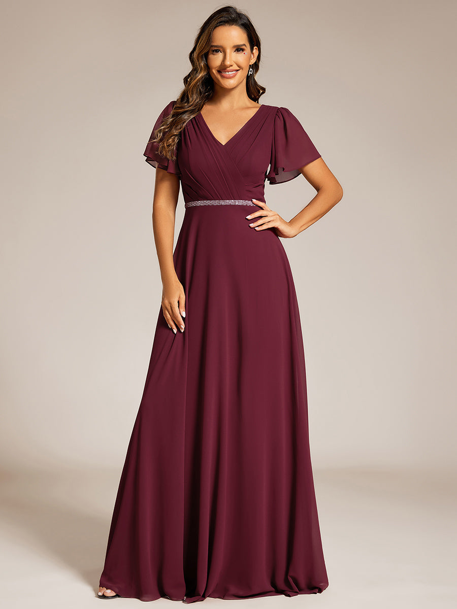 Elegantly crafted, this midi-length chiffon evening dress exudes sophistication and style. The ruffled sleeves add a touch of femininity and romance, while the empire waist design accentuates the natural curves of the body. A sleek belt cinches the dress at the waist, creating a flattering silhouette. Perfect for any formal event, this dress is sure to make you stand out in the crowd with its chic chiffon fabric and impeccable details. Embrace your inner elegance and make a statement with this stunning evening dress.