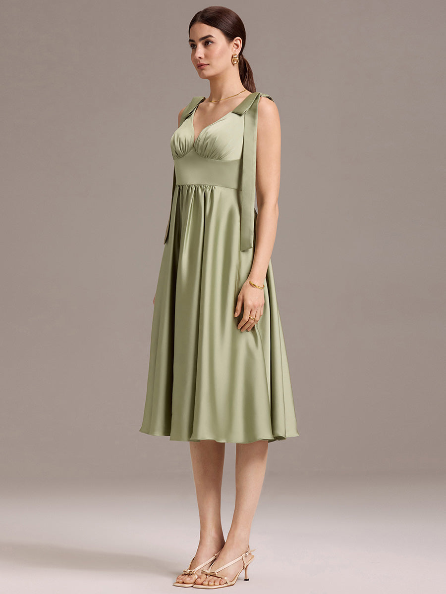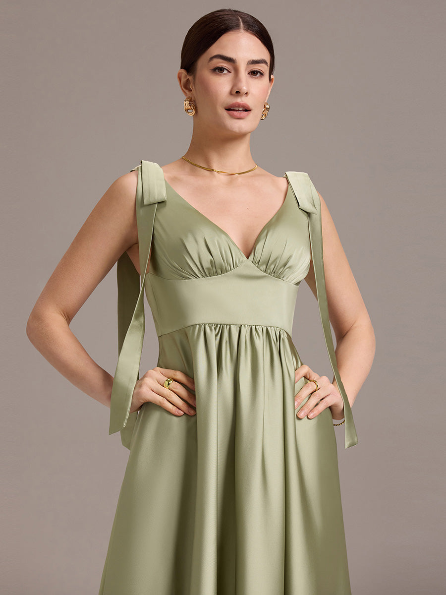 Elegant V-neck sleeveless dress with tie-shoulder design, crafted from smooth satin. It features a gathered bust and flowy midi - length skirt, plus handy pockets. A concealed back zipper ensures easy wear¡ªideal for weddings, a romantic and practical piece retailers can offer to clients seeking grace and comfort.