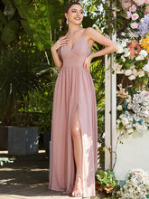 Add a great addition to your wonderful collection by adding this bridesmaid dress. The dress is designed with a deep V-neck, spaghetti straps, and A-line silhouette.