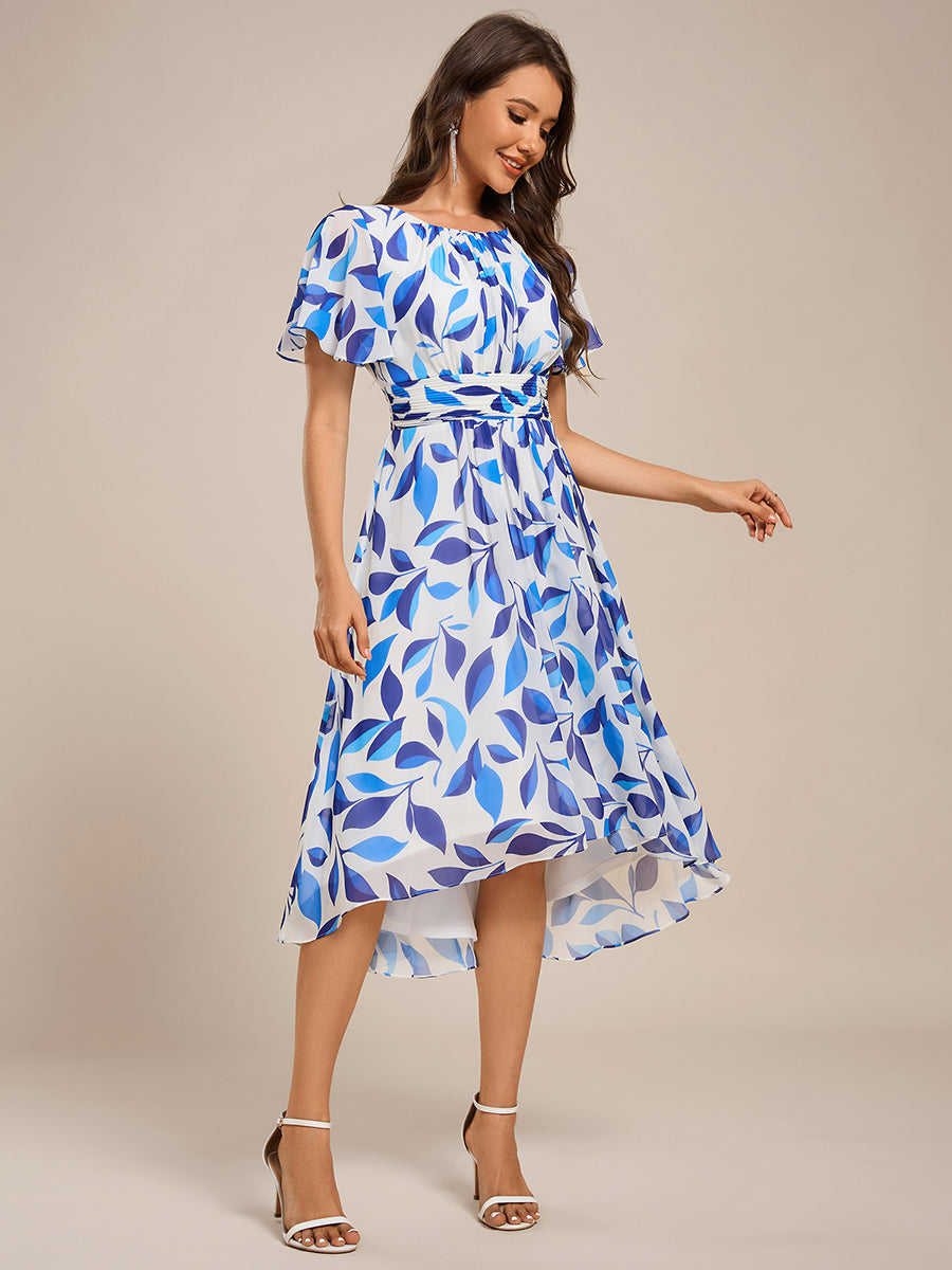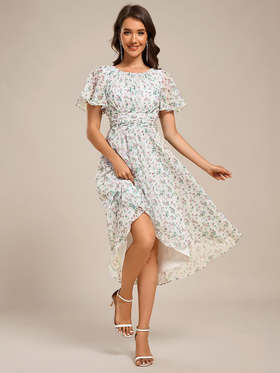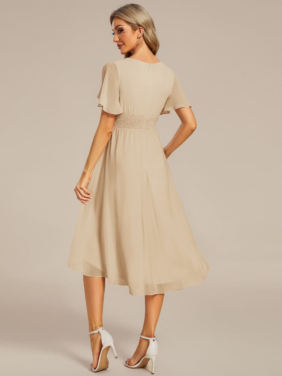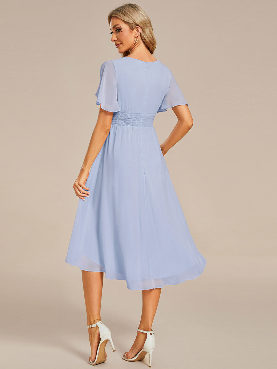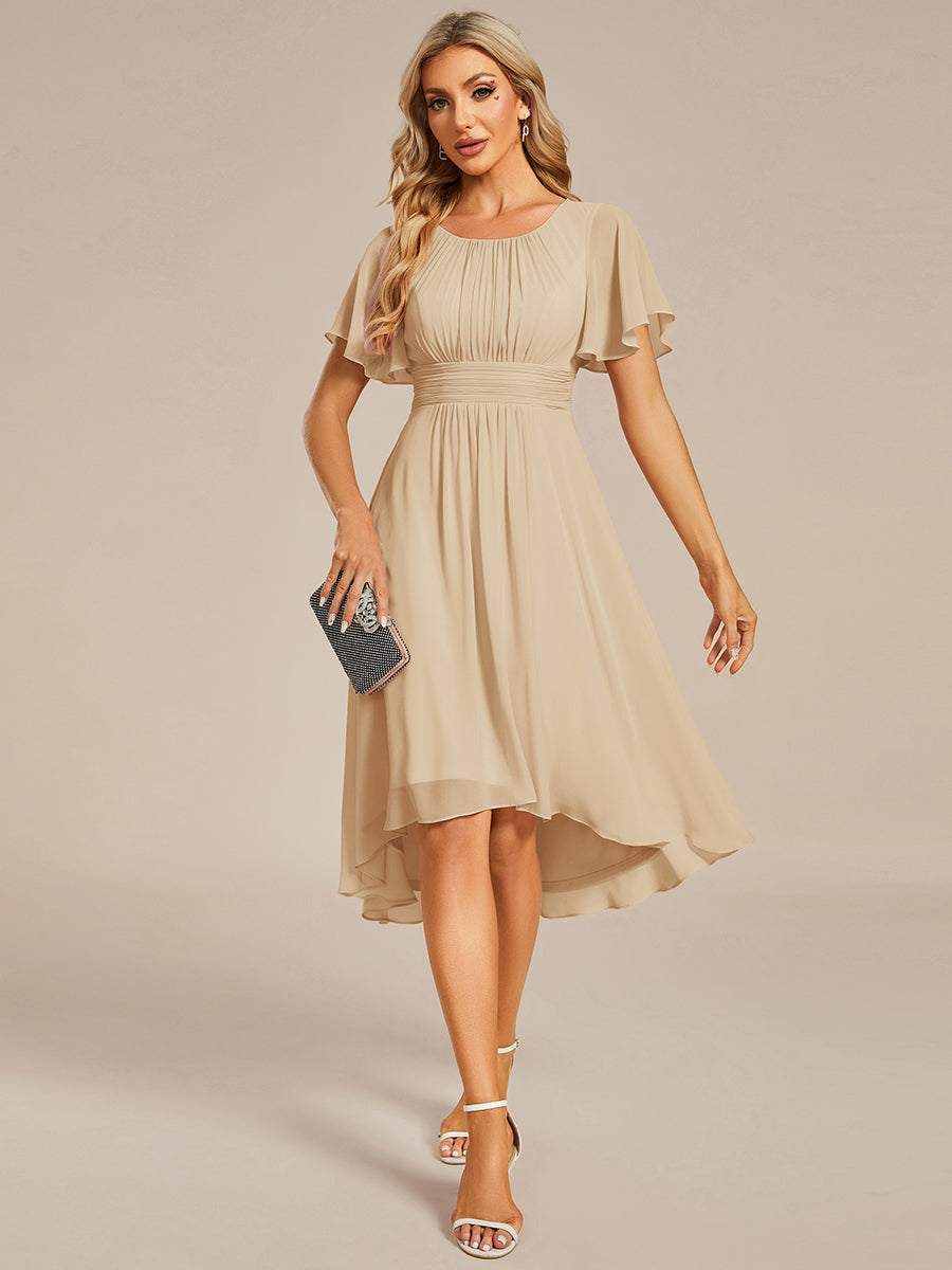 Elevate any occasion with our chiffon dress, a perfect blend of comfort and style. The graceful design includes a round neckline, short sleeves, and an A-line silhouette, striking a balance between sophistication and youthful charm. Ideal for bridesmaids or wedding guests, this knee-length dress ensures you stand out with elegance and flair at any special event.