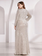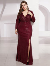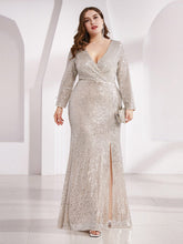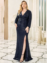 Featuring a deep V neckline, long sleeves and thigh high slit, this sexy sequin dress is sure to make a statement no matter where you wear it.