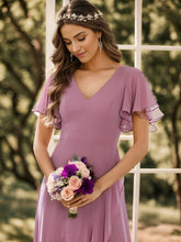 The A-line silhouette is flattering on all body types, creating a feminine and graceful shape that is both comfortable and stylish. The V-neckline is adjustable to ensure a perfect fit, while the flowing chiffon material ensures that the dress is comfortable to wear for extended periods.