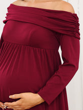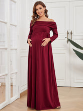 Put a great impression on everyone by wearing this floor-length maternity dress. This dress features off shoulders, long sleeves, and an A-line silhouette. The pleated decorations on the dress also make it look unique.