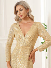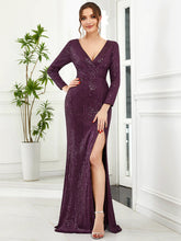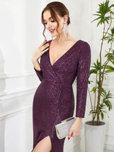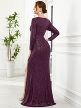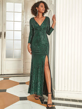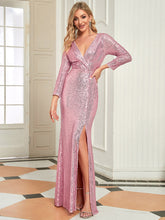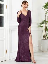 Featuring a deep V neckline, long sleeves, and thigh-high slit, this sexy sequin dress is sure to make a statement no matter where you wear it. Perfect for all formal occasions, from evening party, cocktail, weddings to prom, homecoming,and graduation!